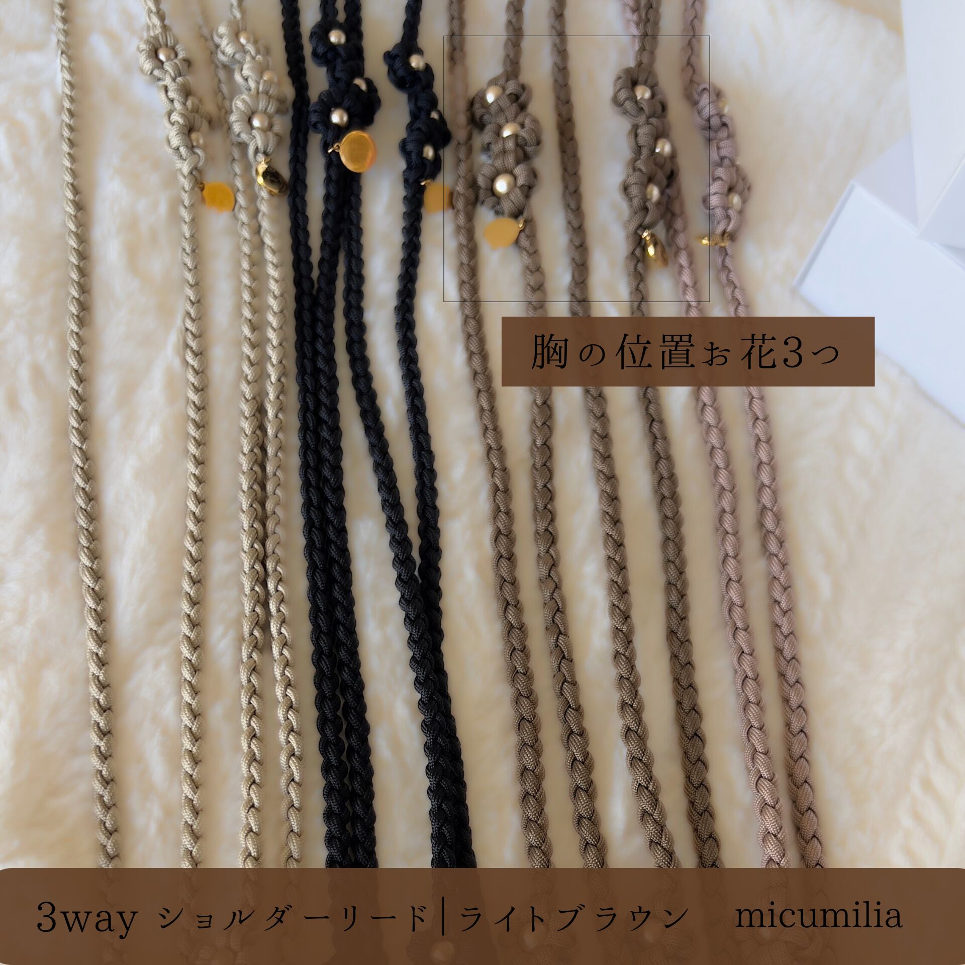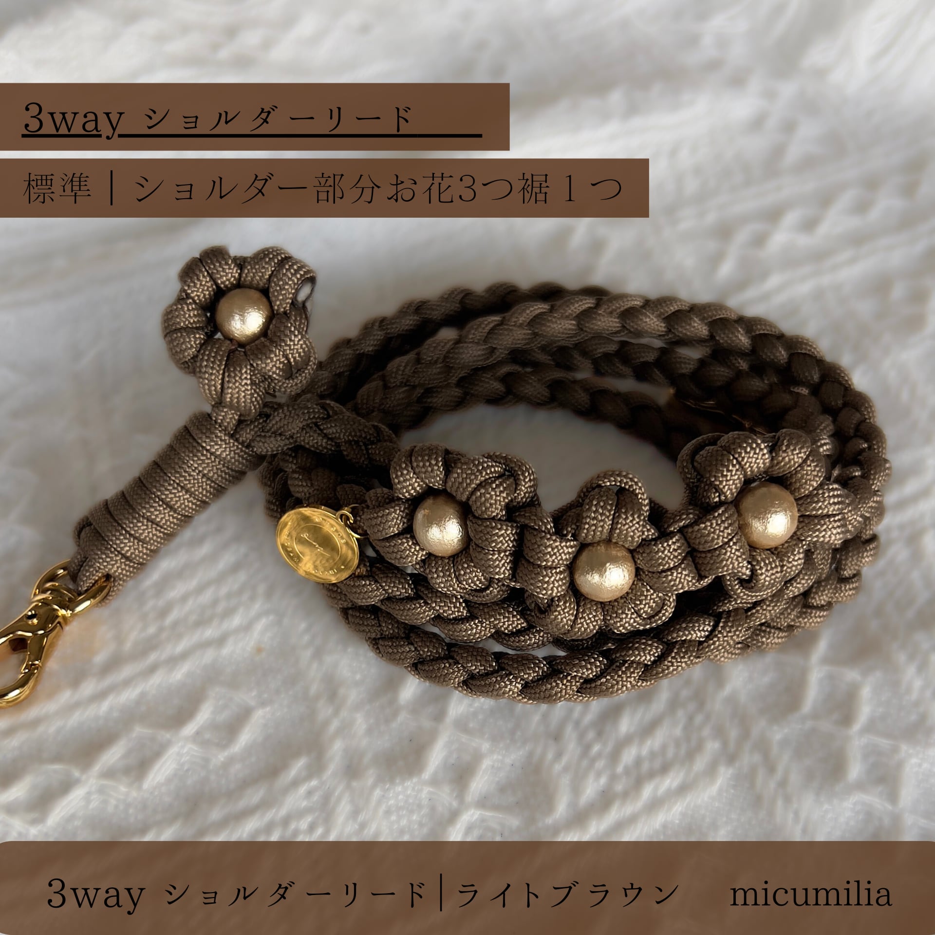 3wayショルダーリード(ライトブラウン)+お花モチーフ2点追加