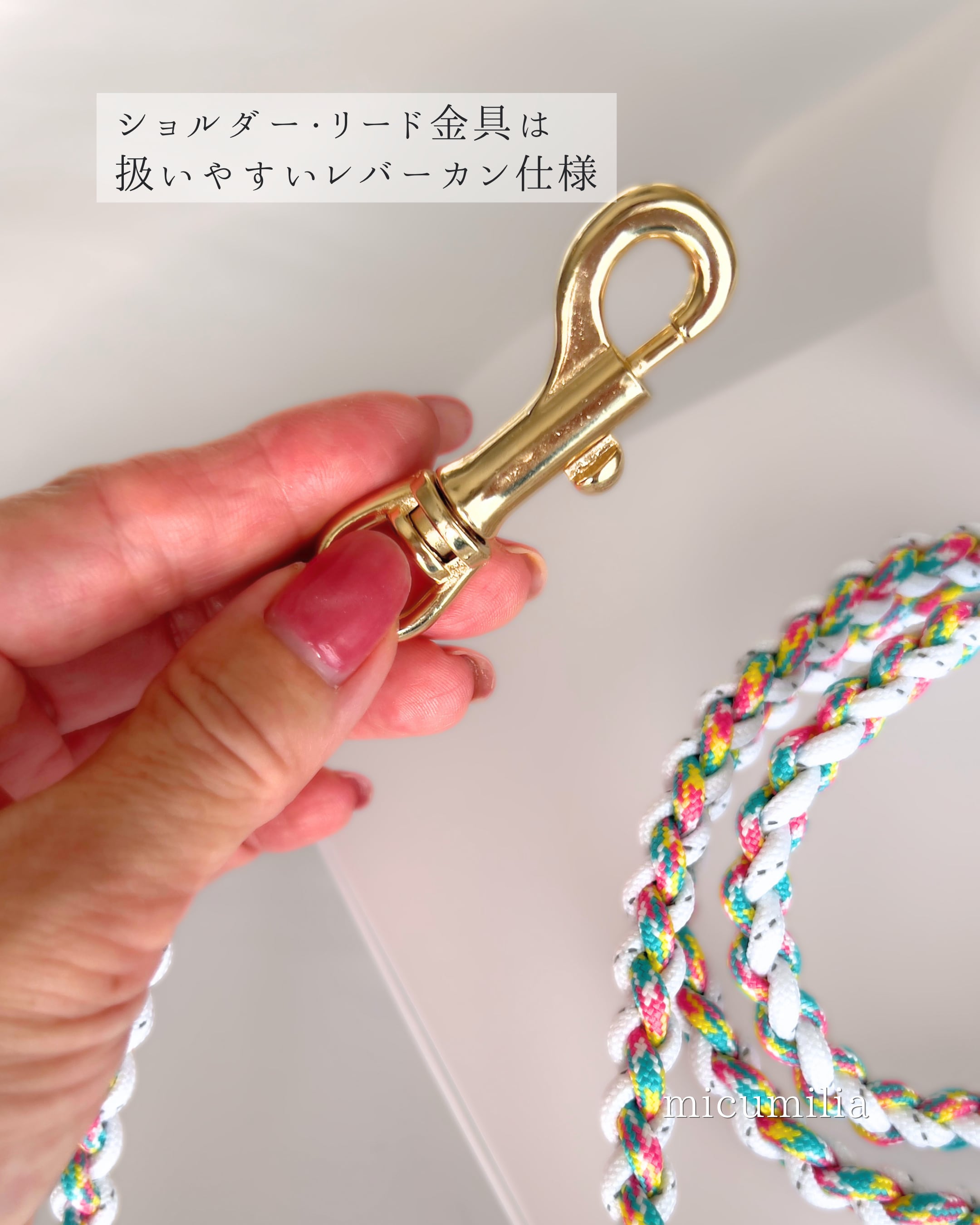ショルダーの片側レバーカンをリボン下のマルカンへ付け替え、手持ちのロングリードとして使用
